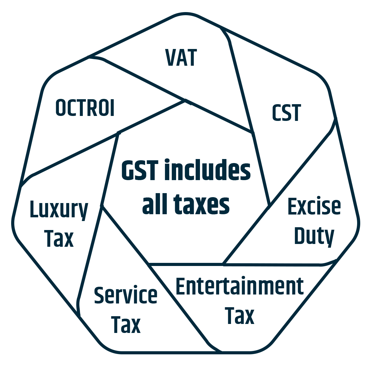The full form of GST is Goods & Services Tax. It is an all-in-one tax that subsumes a variety of state (VAT, Entertainment Tax, Luxury Tax, Octroi) and central taxes (CST, Service Tax, Excise Duty).