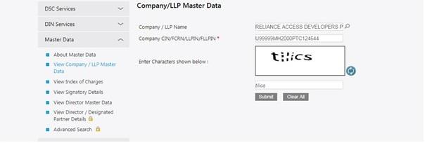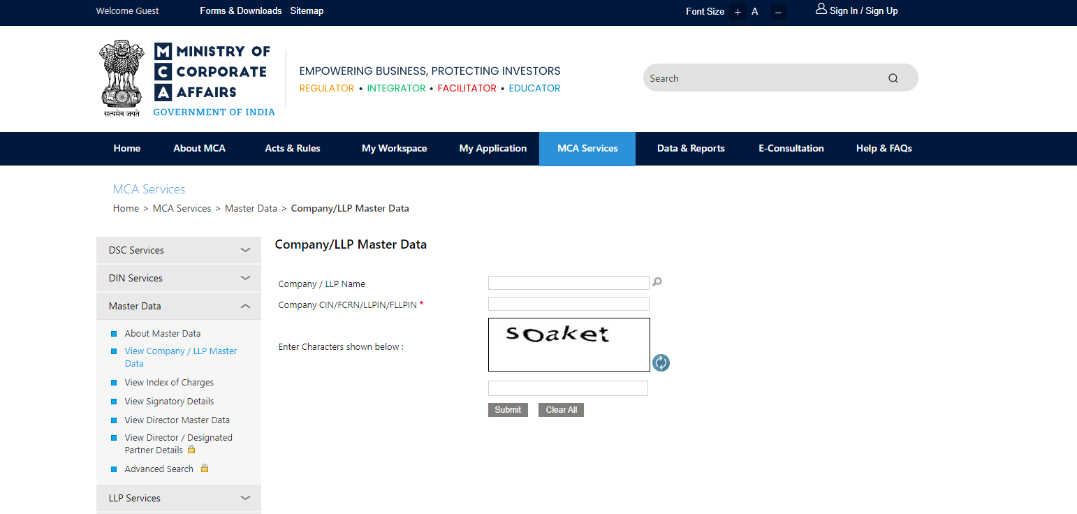 You can enter either the company name or the CIN or both of them to know the information about it. Apart from entering the company name or CIN, you need to enter the captcha code and press submit.