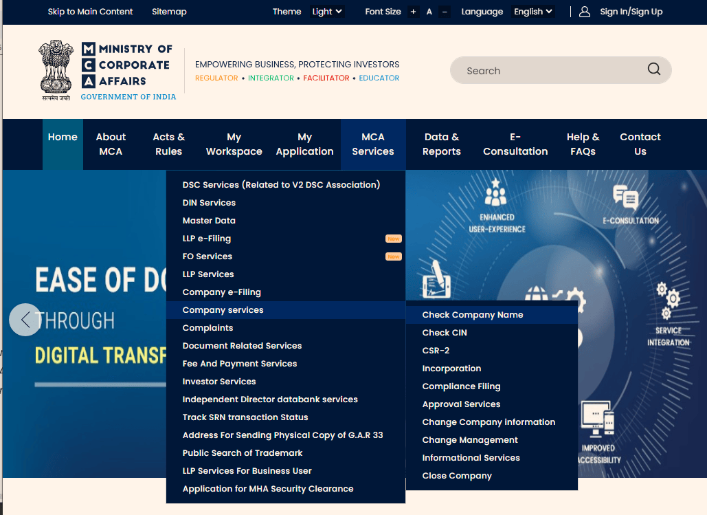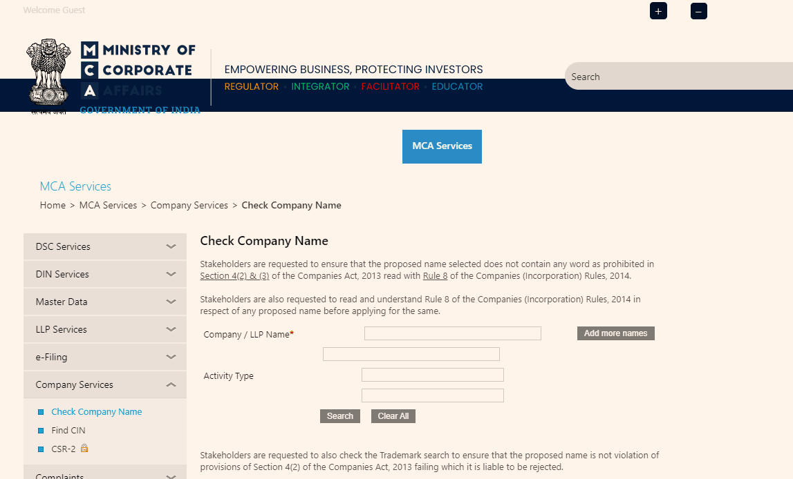 Step 2: Click on MCA Services, then Company Services and lastly choose check company name.