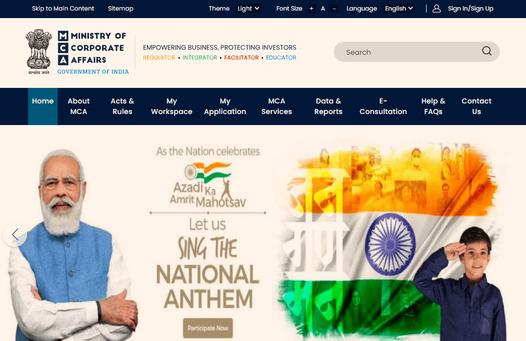 Step 1: Visit the official website of Ministry of Corporate Affairs (MCA).