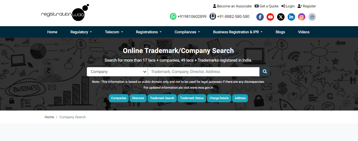 Alternatively, you can find CIN using Registrationwala’s company search option. Just select ‘company’ from the drop down list and type the name of the company you want to search CIN of.