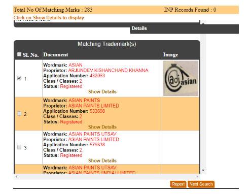 For your better understanding let us take an example. Suppose an application is made for trademark Asian in class 2 and below are the results of its search.