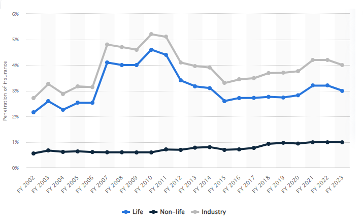 According to Statista, India's insurance penetration stood at 4 percent, with the majority coming from the life insurance sector, in the financial year 2023.