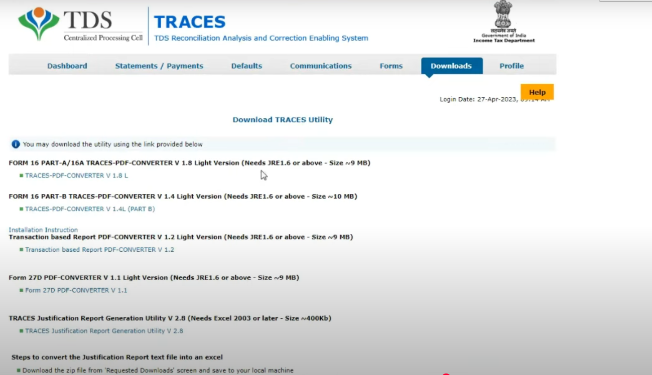 Step 11: Now, you have to click on TRACES PDF Converter V 1.5 Light Version to download the utility for converting T.D.S certificate (Form 16A) to PDF.