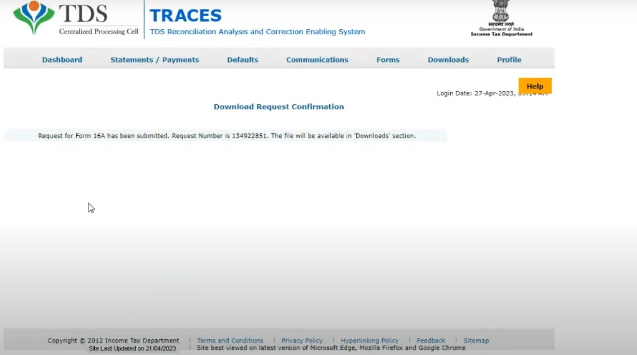 Step 8: After successful validation of KYC details, a message and a request number will appear on the screen. After the request status is ‘submitted’, wait for 24-48 hours. When the status is ‘available’, you can access and download the T.D.S certificate (Form 16A) from the ‘Download’ section.