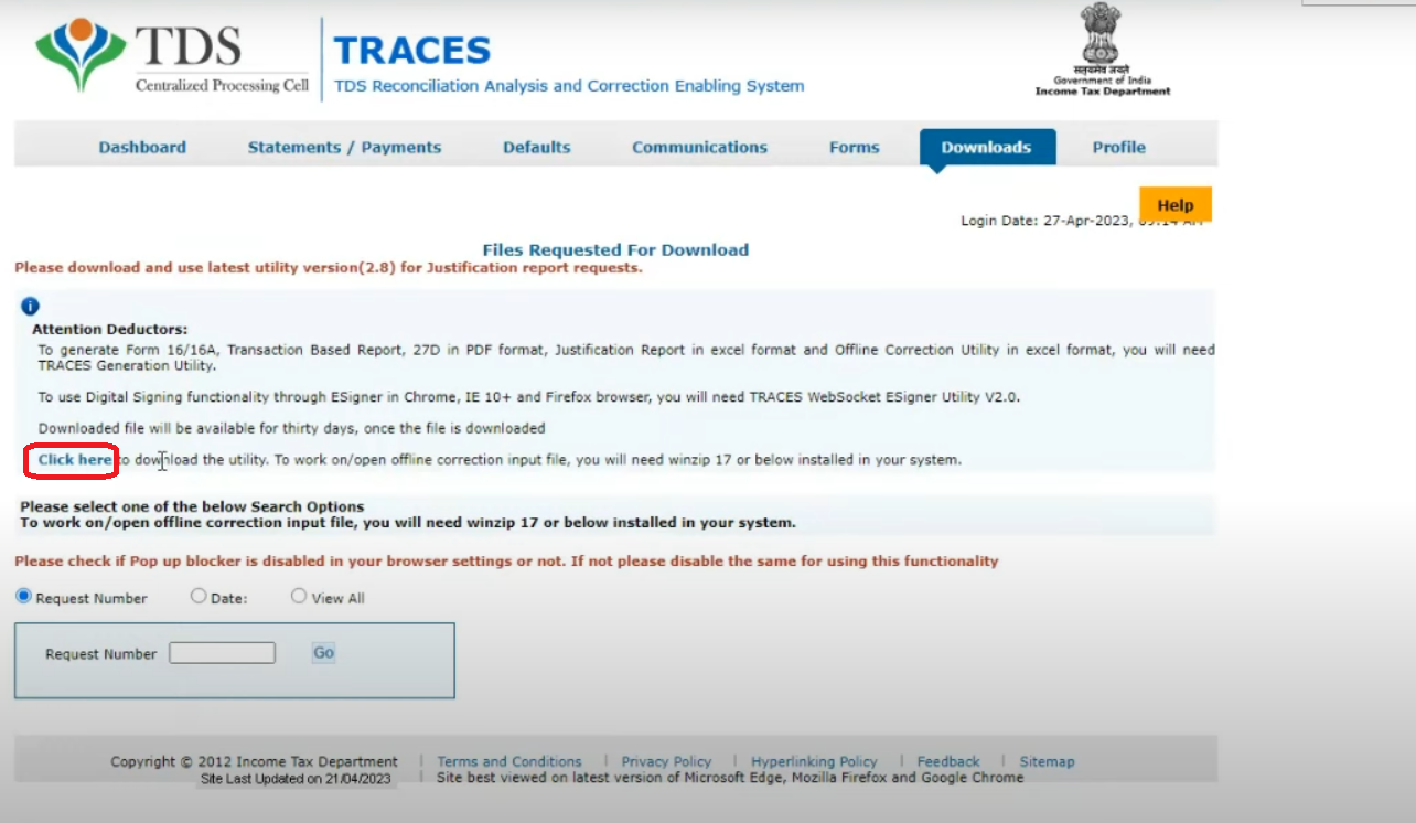 Step 10: Now, you must download TRACES Utility. Go to downloads, then choose ‘files requested for download’, then select ‘click here’. After this, enter the captcha code on the next page.