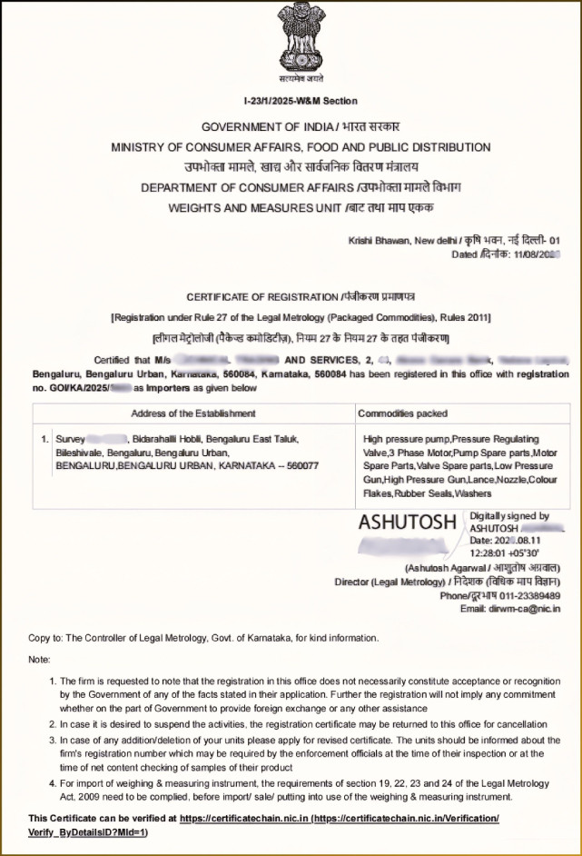 Recently, our team at Registrationwala successfully helped a Bengaluru-based client obtain a Legal Metrology Packaged Commodities Registration Certificate for Importers under Rule 27 of the Legal Metrology (Packaged Commodities) Rules, 2011, from the Director of Legal Metrology under the Weights and Measures Unit, Ministry of Consumer Affairs, Government of India.