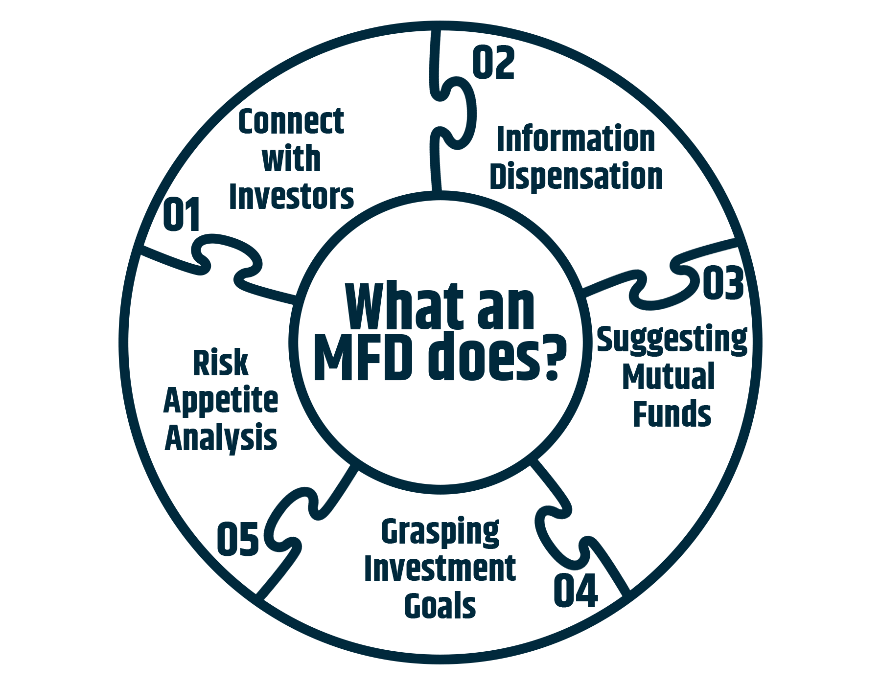 A Mutual Funds Distributor can be thought of as a Person or a Company involved in the sales and distribution of Mutual Funds to prospective investors. These MFDs work on behalf of major Mutual Funds Houses or Dispensers. An MFD is basically an Investment Intermediary. They play a vital role in the financial world by arranging a connection between the Investors and Mutual Funds Investors for services like the stock market or mutual funds.