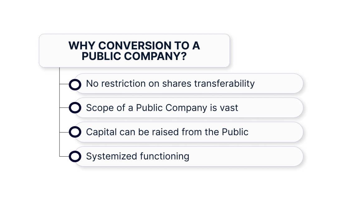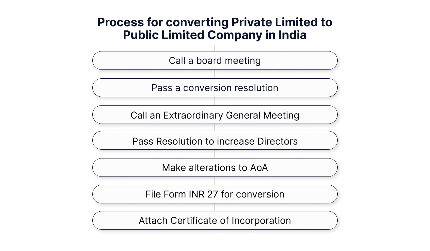 How to convert a private company into a public company? The process of conversion of a Private Limited company to a Public Limited Company is as follows: