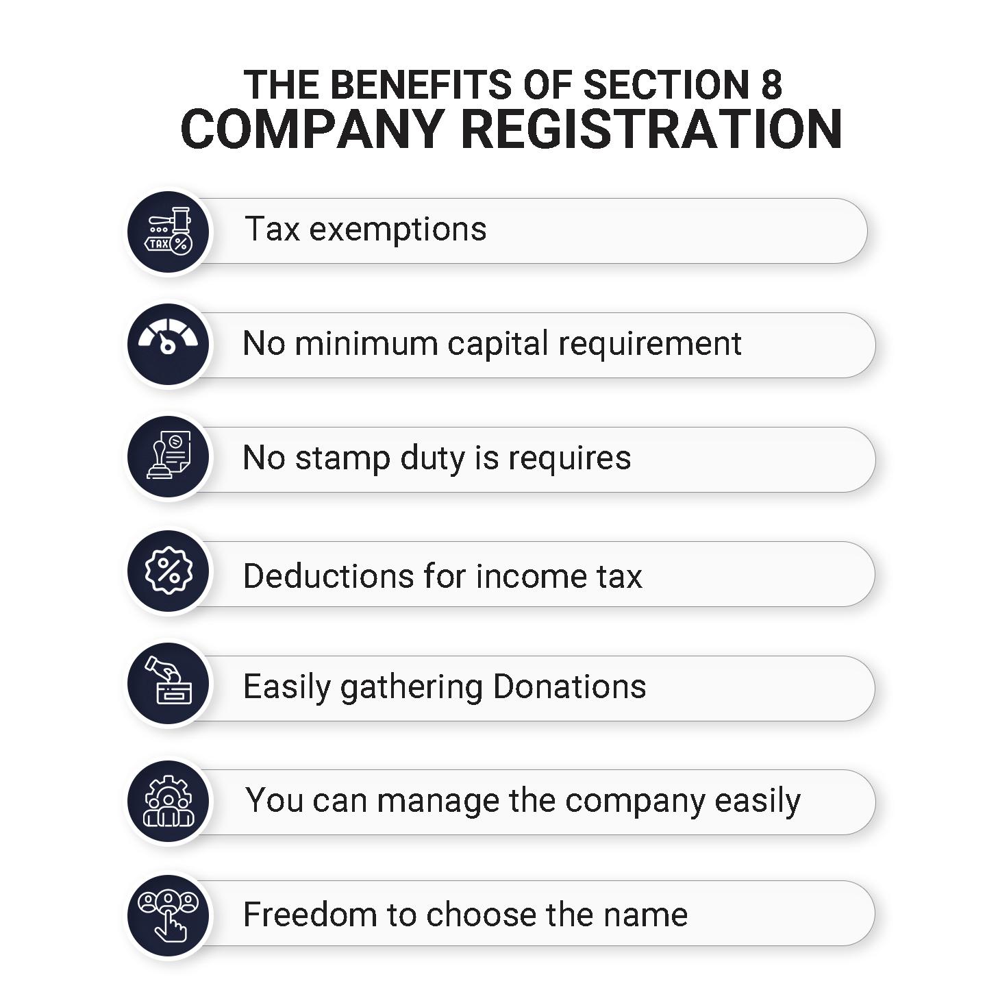 Basically, the Section 8 company is similar to an NGO Company. The profit earned by the company is used for the above mentioned purpose and not paid as a dividend among members. The business registration of the company is done under the Companies Act, 2013. The benefits of the section 8 company only came into picture when the registration got done.