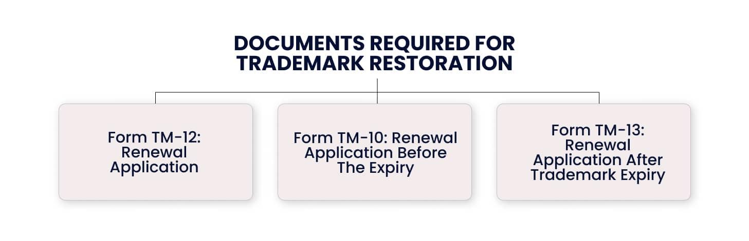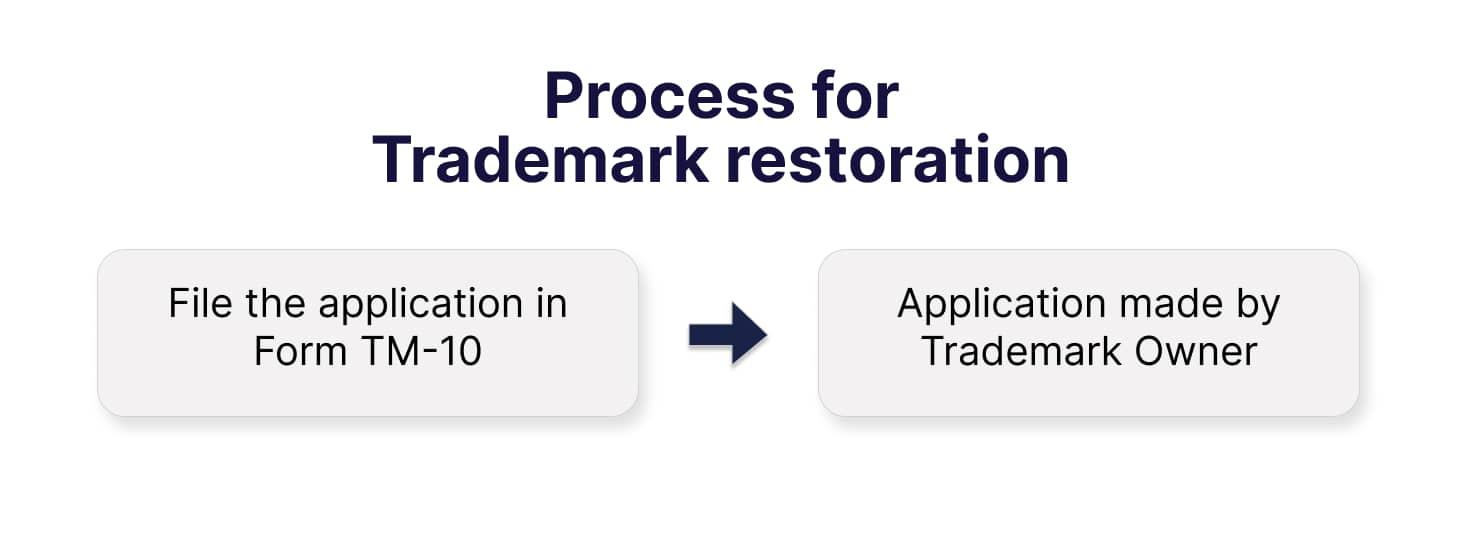 A. Form TM-13: The restoration application must be filed when the trademark is removed from the register of trademarks. The renewal and restoration process will take place six months to one year after the registration expiration date, and both renewal and restoration fees are levied to the applicant.